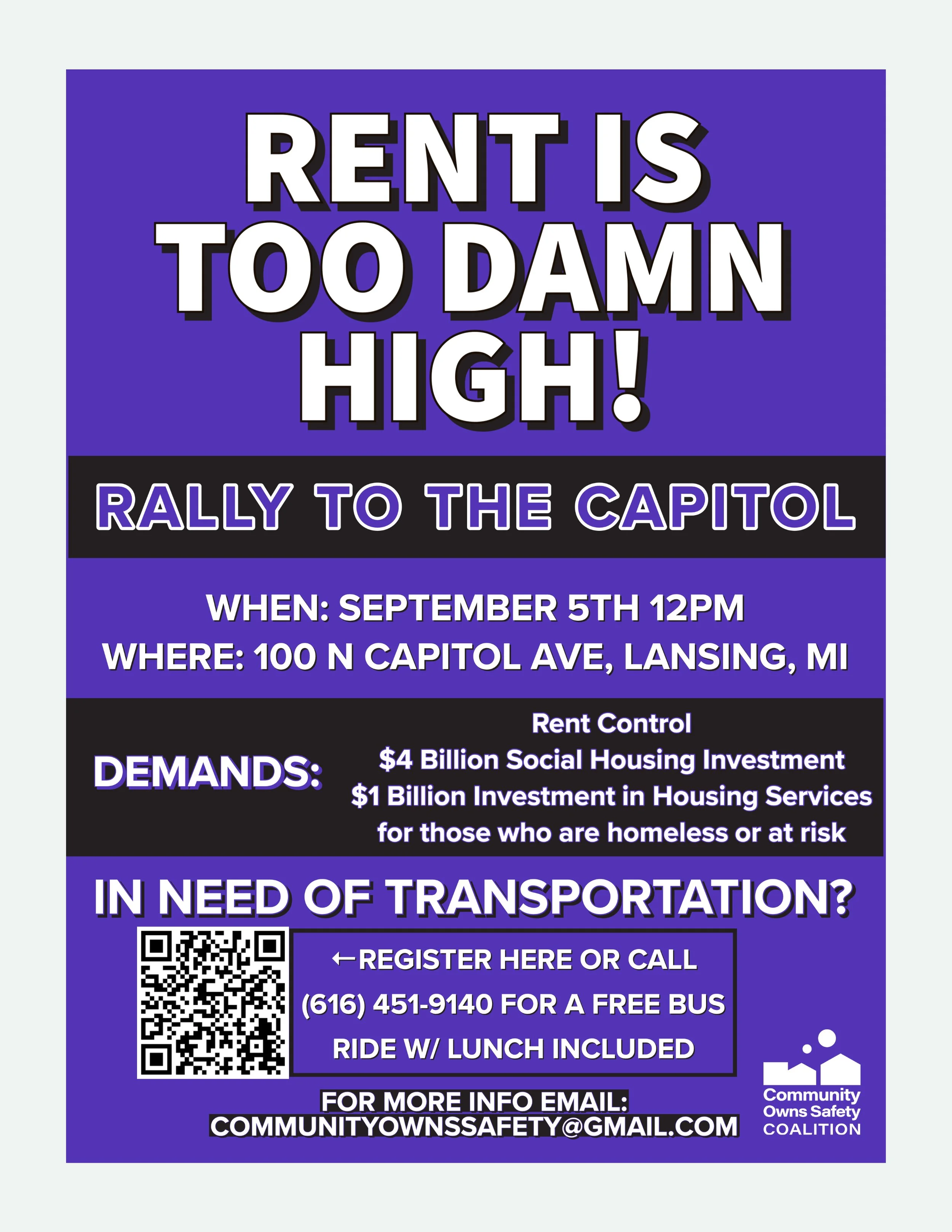 Seating is limited, so please let us know as soon as possible by registering today. If you do not need transportation and are still planning to attend, register with the event organizers here: The Rent is Too Damn High: We Pledge to Demonstrate at the Michigan Capitol for Good Housing on 9/5/23
